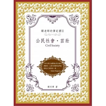 - 出版社:開學文化公民社會與知識的「返身性」公民社會代表了在一個自由國度裡的政治生活…只有在真正地實踐公民社會的事務時,人類才會發現他們能展現自己最好的一面,充分運用他們的才能,並且找到他們最珍貴之感情可以投注的對象。─Adam Ferguson在《顧老師的筆記書I:學習社會.繁盛》出版之後,緊接著的任務,就是這本《顧老師的筆記書II:公民社會.茁壯》了,說起來,這兩本書都是我十幾年來觀察台灣社會的變遷,同時參與打造一個更文明、自知、自信之生活條件的反省心得。我在每篇文章後面,以「隨想.筆記」的方式,簡要提示了文章書寫的脈絡,以及與現在情境的關聯性,希望不只紀錄我們這個世代做過的努力,也盼望激勵更多同伴一起來圓「公民社會」的大夢!